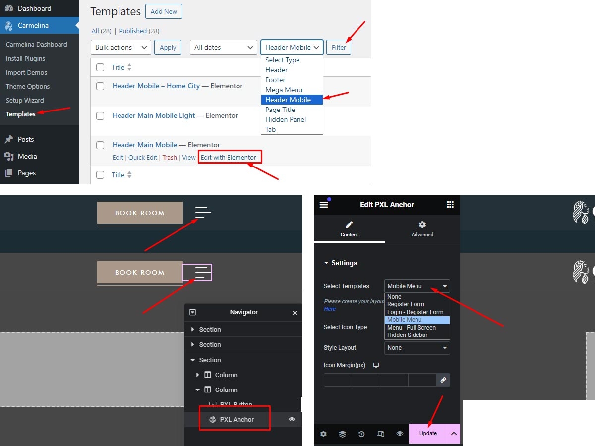 " link from Hidden Mobile Menu layout you want changingIn Elementor page builder editor, you can change menu, text, ...