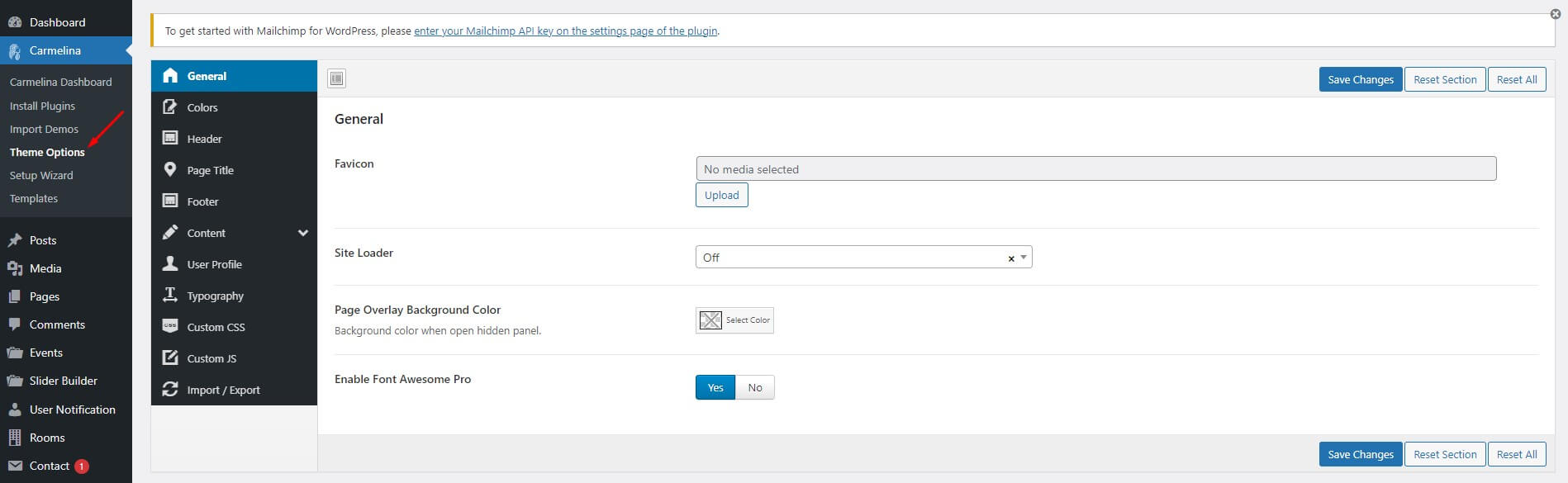 The options panel is home to all of the theme's extensive configuration options. To view the panel, click on Theme Options in the left-hand menu. Here you have the ability to alter many core aspects that make up how your theme looks and behaves. Any of the options that have some ambiguity to them conviently have descriptions to explain their purpose.