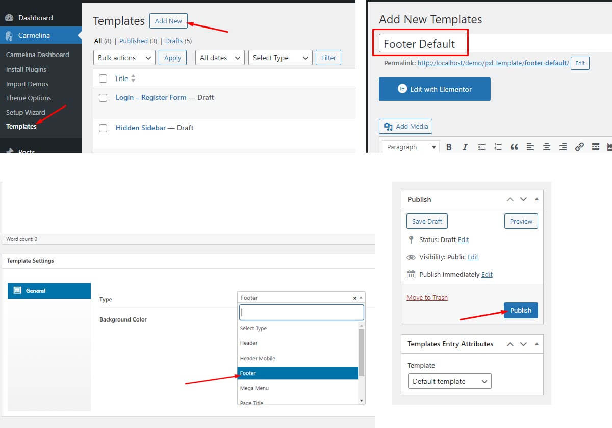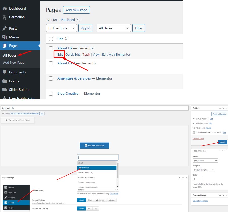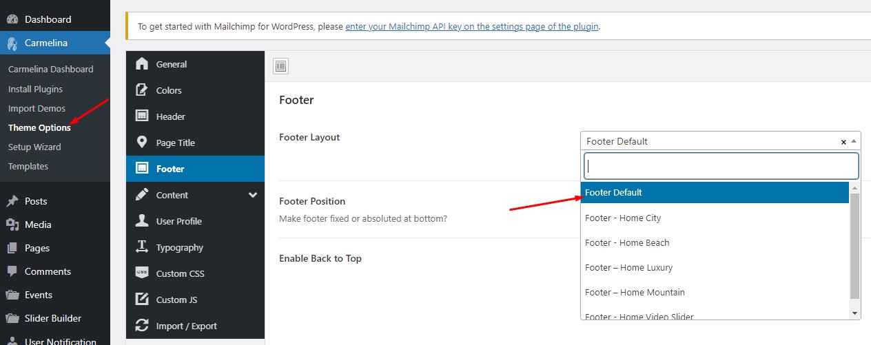 1. Select a layout for footer from Theme Option, this option will be apply for all page and post of site