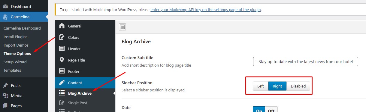 In Theme Options go to Content -> Blog Archive for set Sidebar Position is Left, Right or Disable