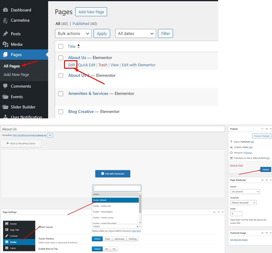 1. Change the layout in Page Options, let go to any page you want to change the Footer layout. Edit that page and then scroll to the bottom. You will see the option for Footer layout in Page Options